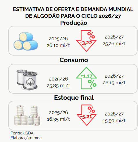 Diante deste cenário, o futuro da pluma deve ser mais equilibrado com estoques finais globais projetados em 15,50 milhões de toneladas, redução de 5,21% em relação ao ciclo 25/26.