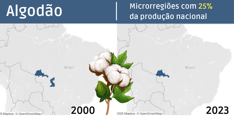 Entre as principais culturas, o algodão é a que apresenta a maior concentração produtiva. Em 2023, a microrregião de Parecis (MT) sozinha respondeu por 25% da colheita nacional. Três anos antes, a liderança era dividida com Primavera do Leste e Rondonópolis, também no Mato Grosso.