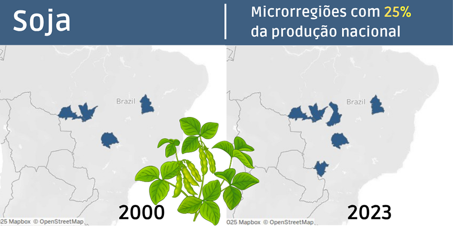 Entre os grãos, a soja segue ampliando sua presença em todo o País. Em 2000, Parecis e Alto Teles Pires, em Mato Grosso, Barreiras (BA) e Sudoeste de Goiás (GO) respondiam por 25% da produção nacional. Em 2023, Canarana (MT) e Dourados (MS) se juntaram a esse grupo.