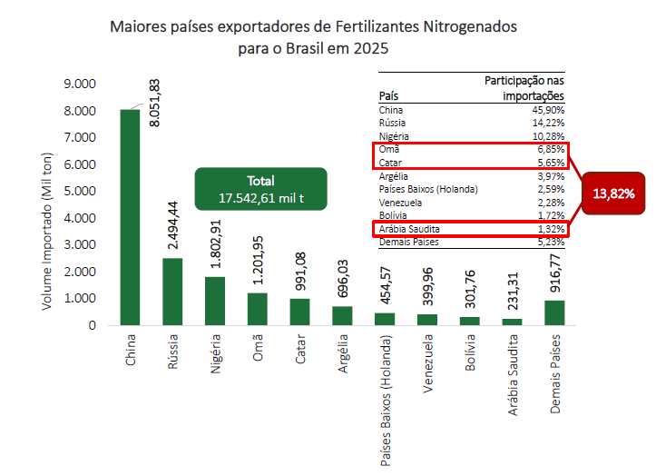 A preocupação do setor está ligada à forte dependência brasileira de fertilizantes importados, uma vez que o País importa cerca de 80% dos insumos utilizados nas lavouras. Somente no ano passado, segundo os dados do estudo, foram importadas cerca de 17,5 milhões de toneladas de fertilizantes nitrogenados, com destaque para fornecedores como China, Rússia, Nigéria, Omã e Catar.