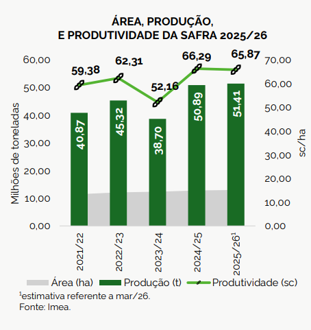 Na safra 2024/2025, o Mato Grosso produziu 50,89 milhões de toneladas, com produtividade média de 66,29 sacas por hectare. Nesta temporada, a projeção da produtividade foi reduzida para 65,87 sacas por hectare, mas o crescimento da área semeada, estimada em 13,01 milhões de hectares, equilibrou os números.