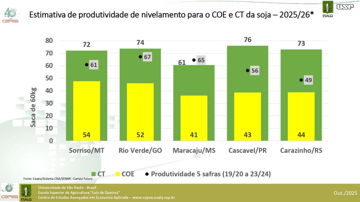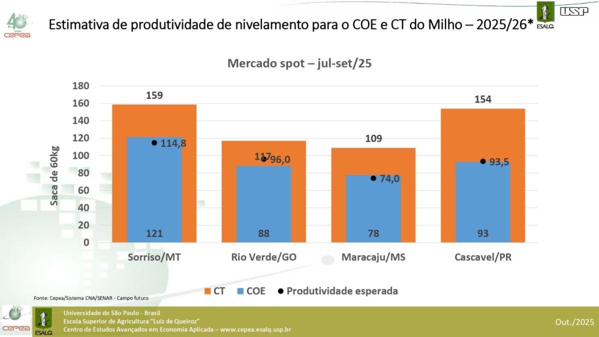 No caso do milho, a questão está mais relacionada a uma expectativa de produtividade menor. Os custos para o cultivo da cultura devem cair 5,9%, porém, a produtividade média deve ficar em 95 sacas por hectare, menor do que as cerca de 114 sacas observadas no ciclo passado. O cálculo da produtividade para a safra 2025/2026 foi feito tendo como base a produtividade média das últimas cinco safras.