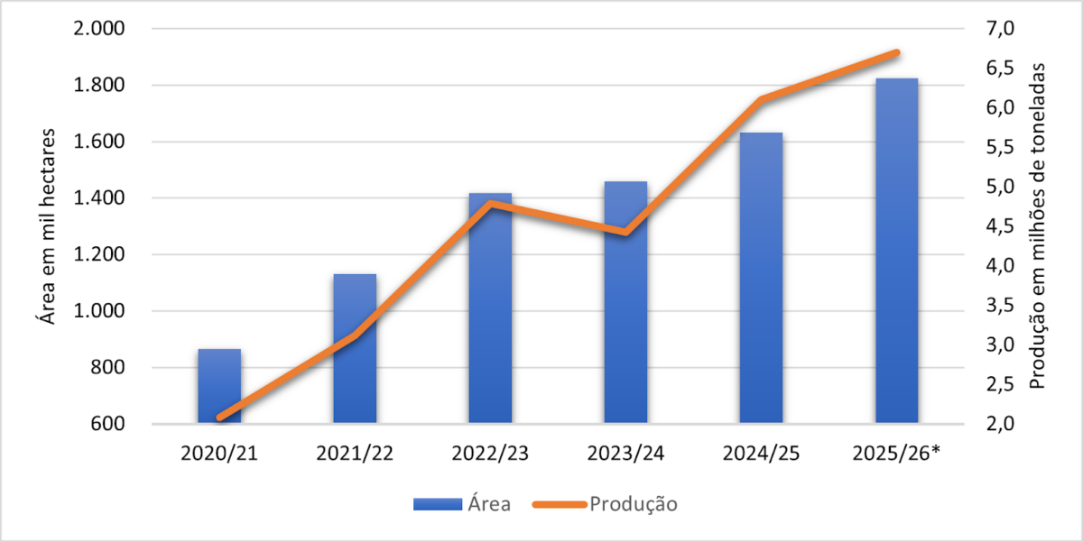 Produção e área semeada com sorgo, entre 2020 e 2026