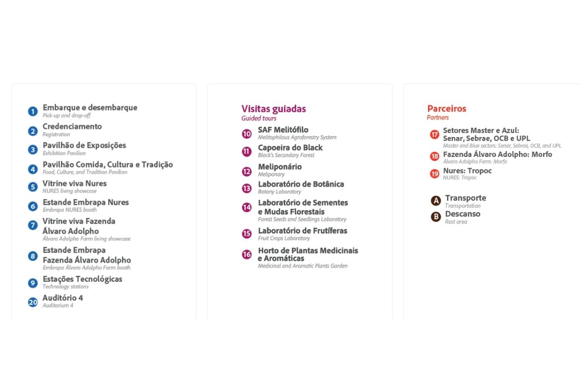 - Fazenda Álvaro Adolpho, transformada em vitrine de intensificação sustentável e diversificação produtiva, com cultivos de soja, milho, trigo, arroz, caupi, amendoim e arranjos agroflorestais com café robusta, açaí, cacau, banana e bacuri.
