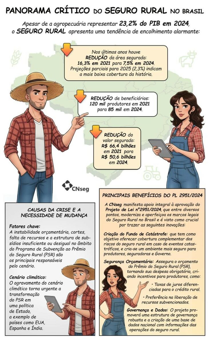 A Confederação Nacional das Seguradoras (CNseg) comemorou a decisão, destacando que a medida chega em um momento de forte retração da proteção agrícola no País. Segundo a entidade, o novo marco legal pode estancar anos de perda de cobertura e recolocar o Brasil no caminho das principais políticas internacionais de gerenciamento de riscos.