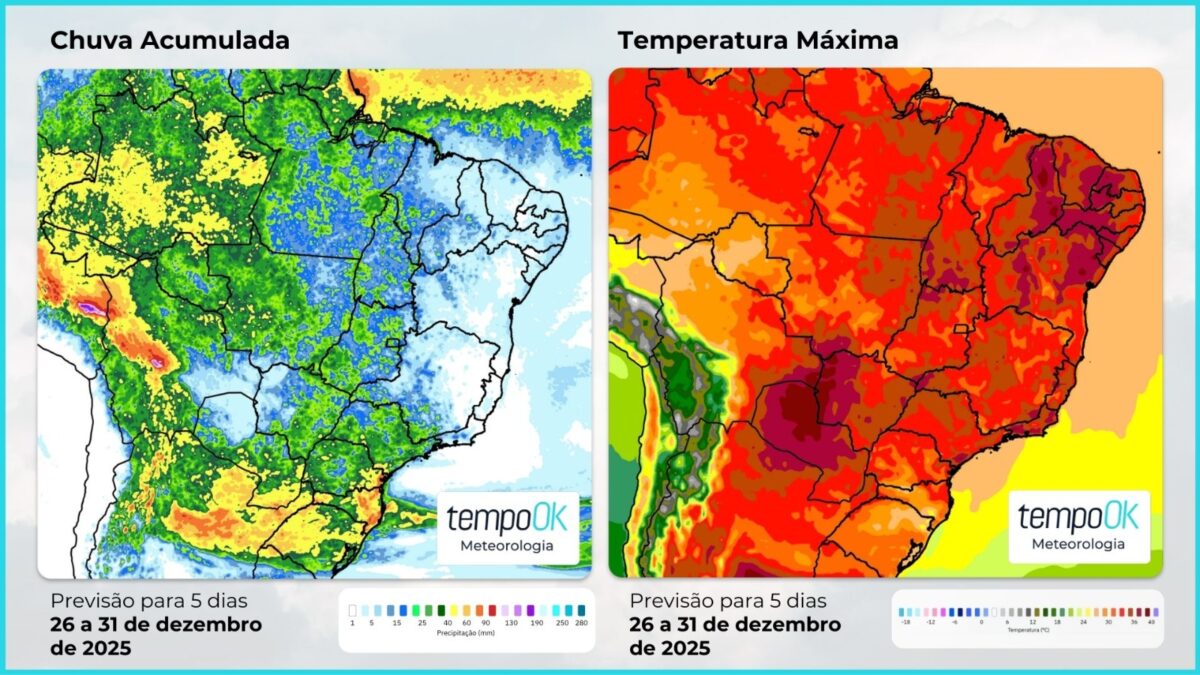 O Brasil entra na reta final do ano com um padrão climático desigual. Até quarta-feira, 31, o calor se intensifica em amplas áreas do País, enquanto a chuva permanece irregular. O cenário combina temperaturas acima da média em regiões agrícolas e volumes elevados de precipitação em pontos isolados, sobretudo no Sul.