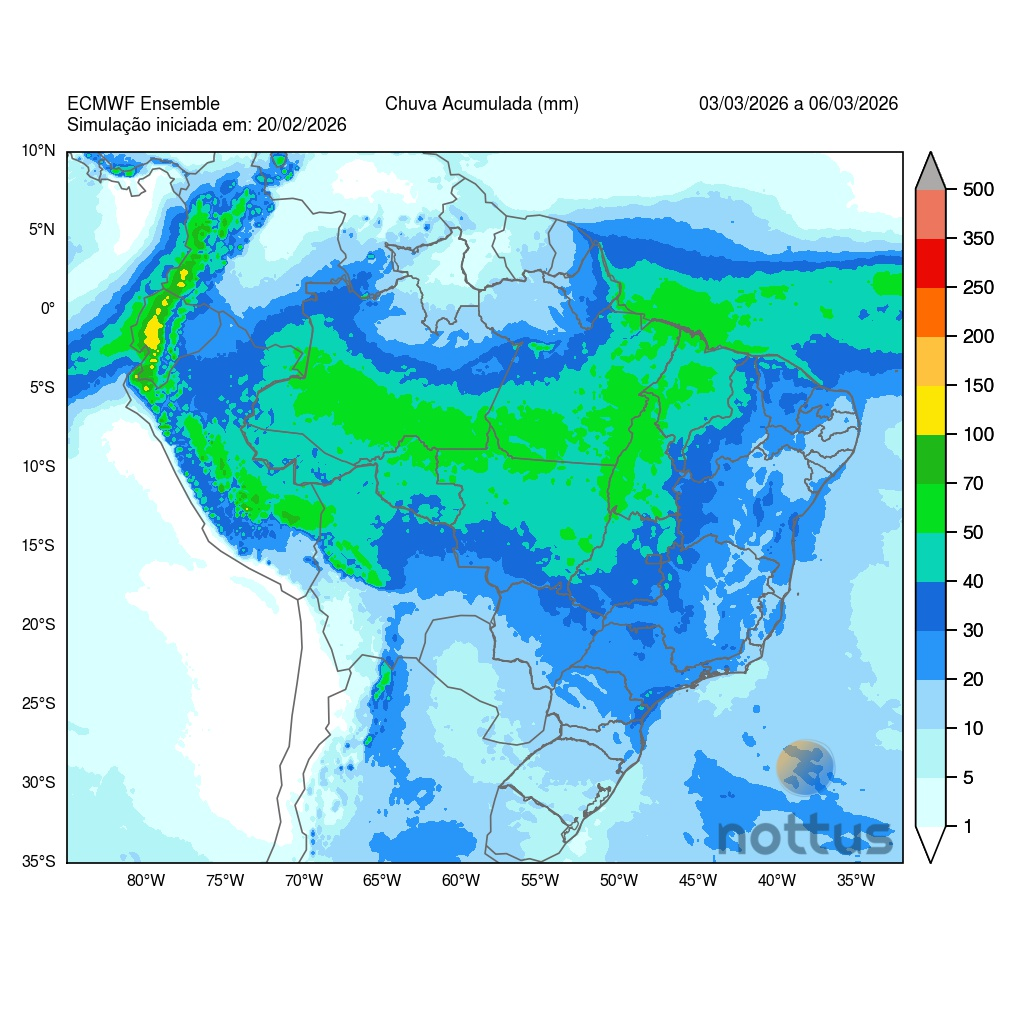 A semana termina com a atuação de uma frente fria na altura do Sudeste do Brasil, mantendo o cenário de instabilidade sobre a porção central do país. Segundo a Nottus, há previsão de bons volumes de chuva no Sudeste, Centro-Oeste, Norte e parte do Nordeste. No Matopiba, as precipitações têm sido frequentes e a tendência é de aumentar ainda mais.