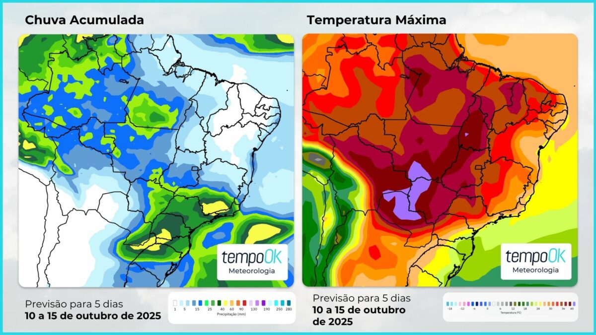As regiões Centro-Oeste e Sudeste terão tempo firme, enquanto o Sul deverá receber um volume significativo de chuva