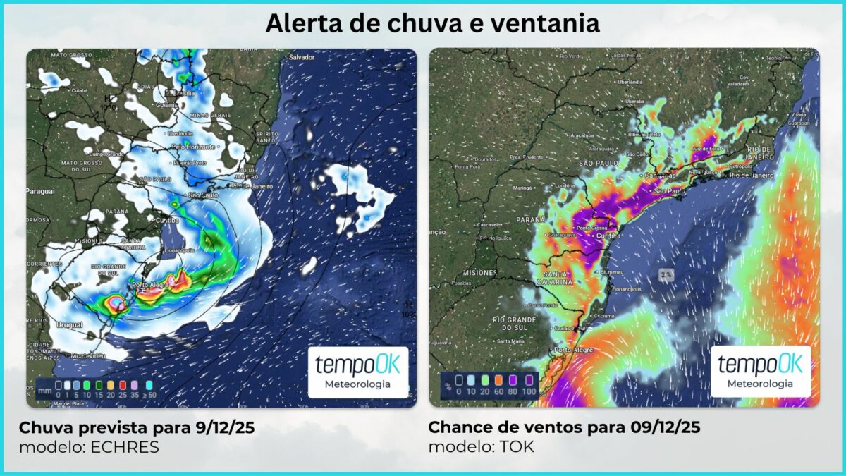 O Instituto Nacional de Meteorologia (Inmet) manteve o alerta vermelho de tempestade para grande parte da Região Sul, válido até 23h59 desta quarta. A previsão indica chuva acima de 100 mm, ventos superiores a 100 km/h e possibilidade de granizo, com risco de queda de árvores, danos em coberturas, interrupção de energia e alagamentos.