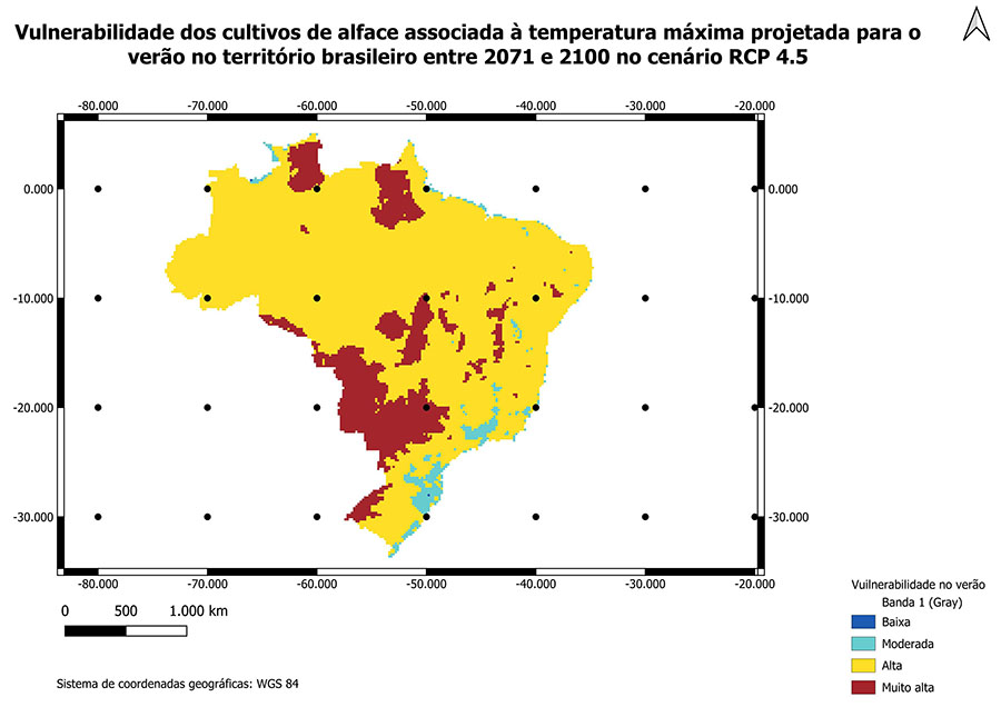 As projeções apontam que o verão será o período mais crítico. As temperaturas poderão superar 40°C em grande parte do País, bem acima do ideal para o desenvolvimento da alface, que exige clima ameno e umidade equilibrada. Entre 2071 e 2100, no cenário otimista (RCP 4.5), 79,6% do território terá risco alto e 17,4% muito alto. No cenário pessimista (RCP 8.5), 87,7% da área nacional estará sob risco muito alto.