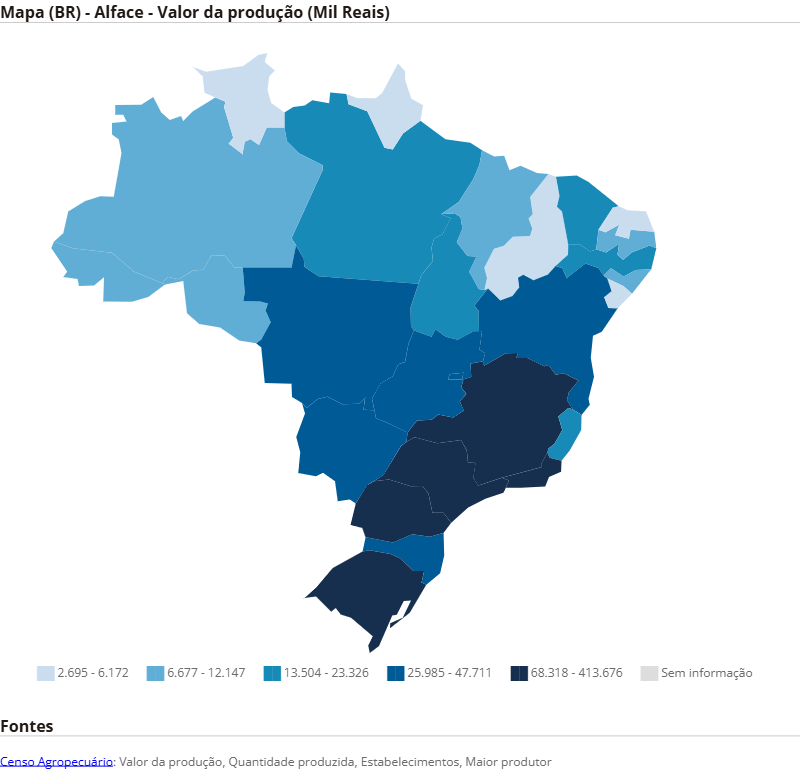 Segundo dados do IBGE, a produção brasileira de alface alcançou 671,5 mil toneladas, movimentando R$ 1,2 bilhão, segundo o censo agropecuário de 2017, quando o País contava com mais de 108 mil estabelecimentos produtores, sendo São Paulo o maior polo de cultivo. Os mapas do IBGE mostram concentração de valor de produção no Sudeste e no Sul, justamente as regiões que também enfrentarão risco elevado nas próximas décadas.
