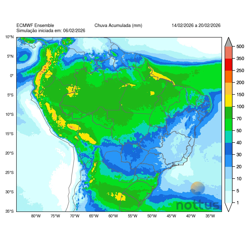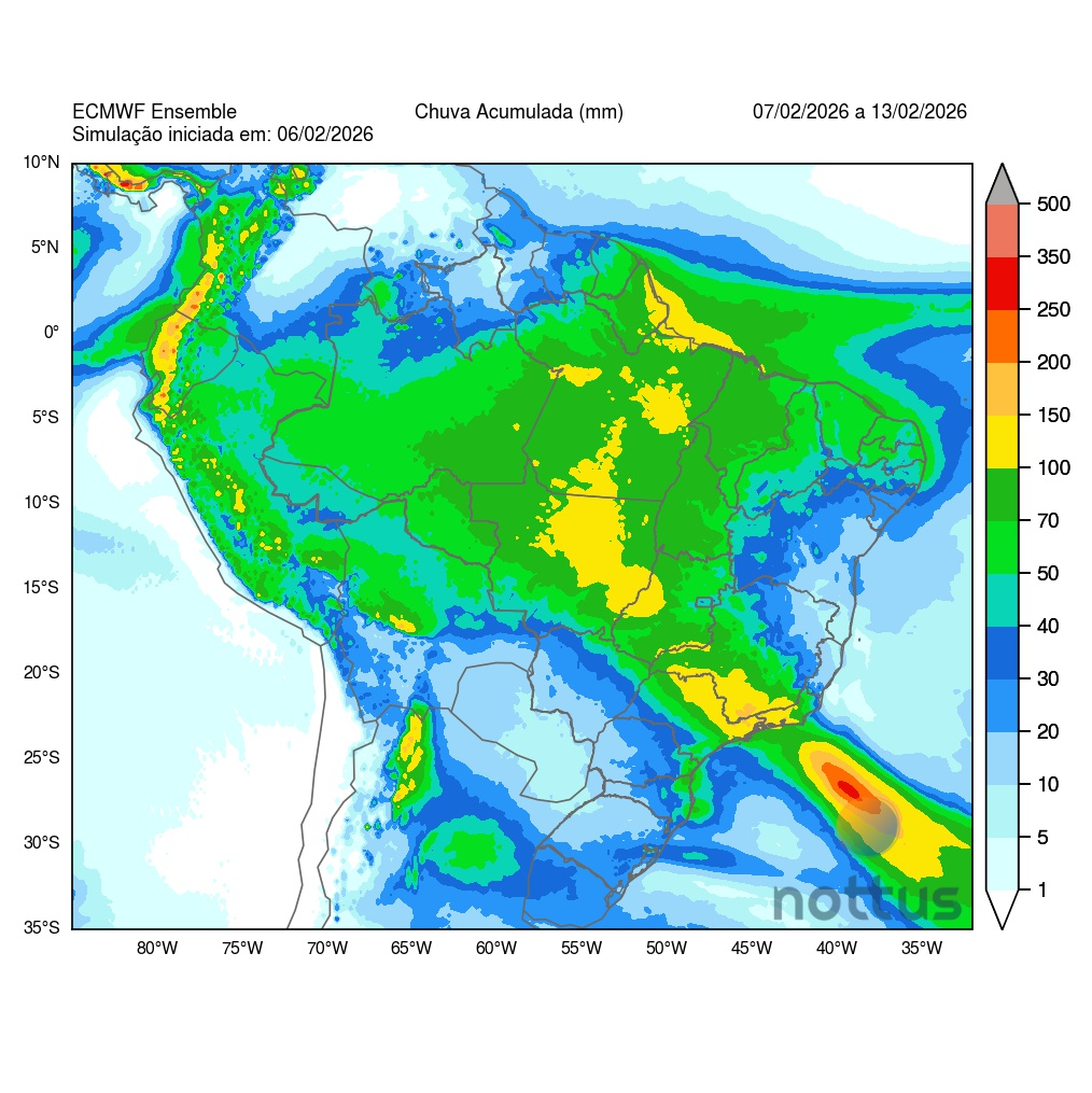 De acordo com a Nottus, de 13 a 17 de fevereiro, será a janela mais favorável para os trabalhos no campo. Depois disso, uma nova nova frente fria deve chegar na região Sudeste, reorganizando novamente as instabilidades ao longo do eixo Sudeste/Norte do Brasil e trazendo o retorno das chuvas para essas áreas.