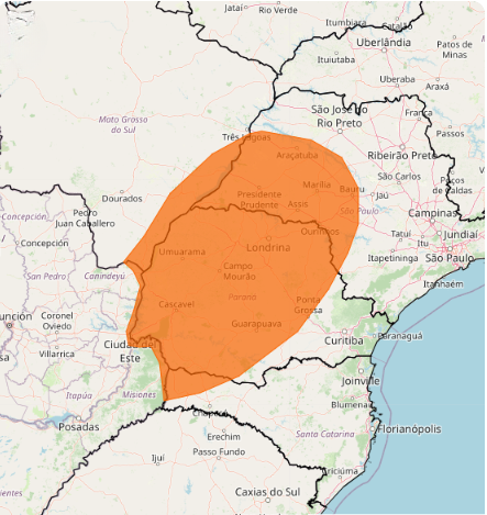 O Inmet também emitiu alerta de tempestade com grau de perigo (laranja) para áreas do Paraná e de Santa Catarina, válidos das 10h25 de sábado até 10h de domingo. A previsão indica chuva entre 30 mm e 60 mm/h ou até 100 mm/dia, ventos de 60 km/h a 100 km/h e queda de granizo. Há risco de estragos em plantações, queda de árvores e alagamentos.