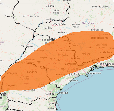 As áreas sob aviso incluem o Triângulo Mineiro, a zona da Mata, regiões de Campinas, Ribeirão Preto, Presidente Prudente e o oeste paulista.