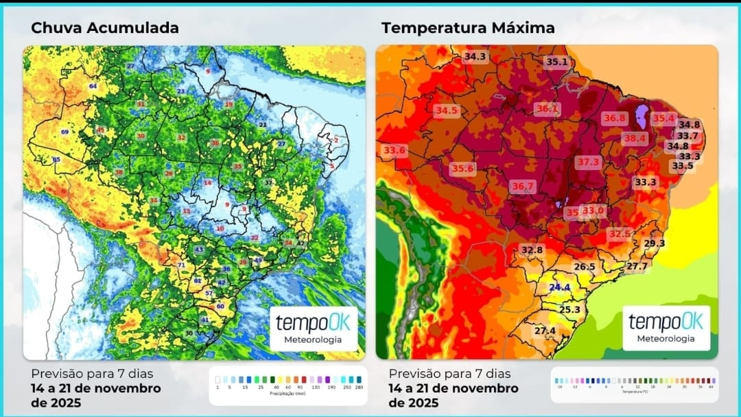 Os mapas da Tempo OK mostram, nos próximos dias, chuvas superiores a 100 mm no Sul e parte do Centro-Oeste, além de temperaturas que podem chegar a 36°C a 38°C no Centro-Oeste, Norte e Nordeste antes da chegada do sistema.