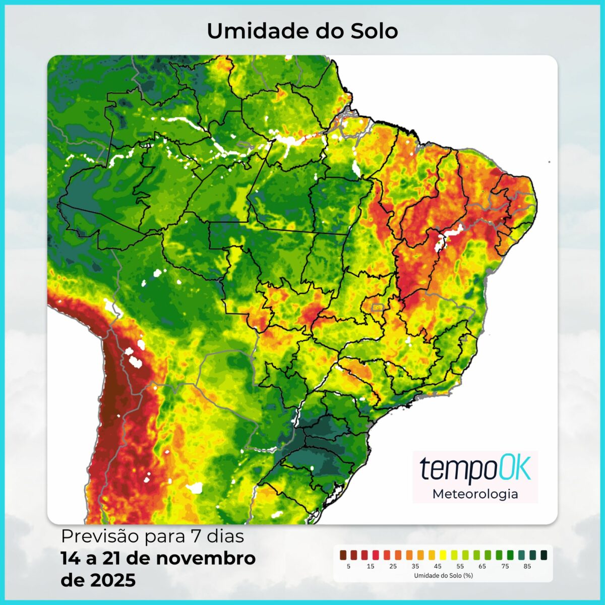 A umidade do solo segue baixa no Nordeste e em áreas de Mato Grosso e Goiás, enquanto o Sul e o Sudeste apresentam condições mais favoráveis, mas com risco de encharcamento após os volumes previstos.