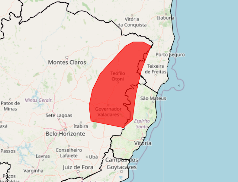 O órgão emitiu alerta vermelho, de grande perigo, válido até 23h59 desta segunda-feira,5, para áreas da Bahia, Espírito Santo e Minas Gerais. De acordo com o Inmet, há previsão de chuva com volume superior a 60 milímetros por hora.