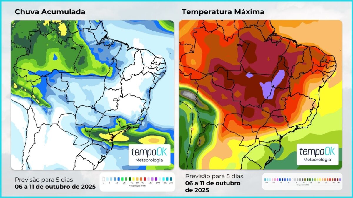 No Centro-Oeste, o Inmet prevê aumento das chuvas entre quinta, 9, e sexta-feira, 10, no sul de Mato Grosso do Sul e no noroeste de Mato Grosso, com acumulados entre 20 e 50 milímetros. As demais áreas seguem com pancadas rápidas e ar seco, com umidade inferior a 30% em Goiás, Distrito Federal e leste mato-grossense.