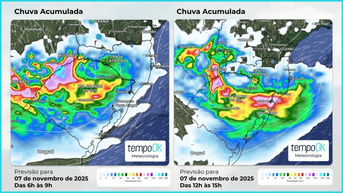 De acordo com Sabrina Custódio, meteorologista da Tempo OK, a formação de um novo ciclone no Sul do Brasil na madrugada de sexta-feira, 7, deixa os dois estados em alerta para a ocorrência de tempestades que podem, novamente, ser acompanhadas por granizo. “Algumas regiões podem registrar volumes elevados, como as áreas de fronteira com a Argentina, e áreas produtoras que ainda não se recuperaram das tempestades desta semana”, destacou.