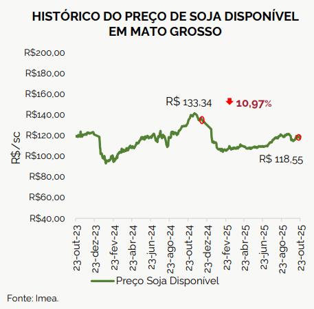 O preço da soja disponível em Mato Grosso encerrou a última semana cotada, em média, a R$ 118,72 a saca, o que representa uma queda de 10,97% em relação ao mesmo período de 2024, informa o relatório semanal do Instituto Mato-Grossense de Economia Agropecuária (IMEA).