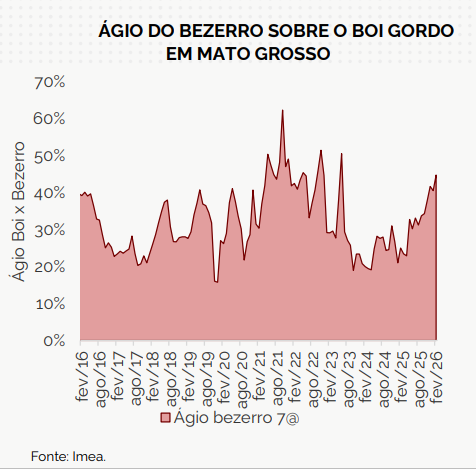 Segundo o Instituto Mato-grossense de Economia Agropecuária (Imea), o bezerro ampliou o ágio sobre o boi gordo, fazendo com que o indicador alcançasse 44,78%, em decorrência da “menor disponibilidade de animais de reposição, aliada à demanda firme”. Uma tendência que deve se manter, remunerando os produtores de cria.