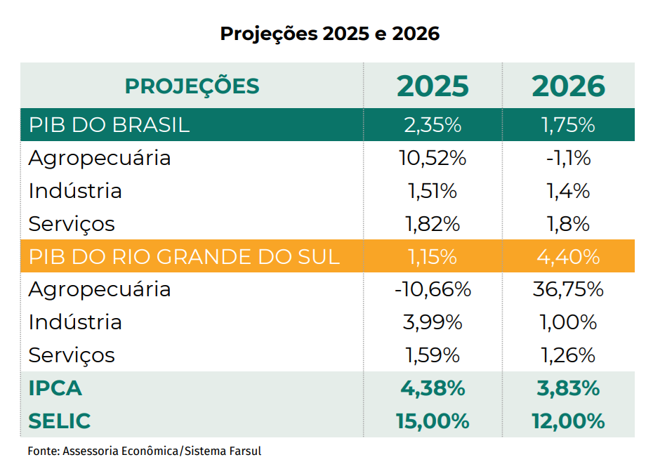 O economista-chefe da Farsul, Antonio da Luz, apresentou projeções para corroborar a visão de Pereira. Para o Brasil, a projeção do PIB indica um crescimento de 2,35% em 2025, caindo para 1,75% em 2026. O setor agropecuário nacional projeta crescimento de 10,52% em 2025, mas uma retração significativa de 1,1% em 2026.