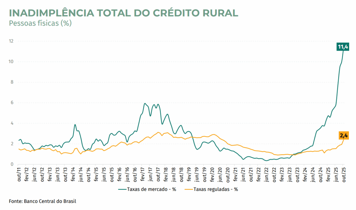 A Farsul argumenta que o Brasil vive a maior distância entre o anunciado para crédito rural e o que realmente foi efetivado. A projeção da equipe econômica aponta para uma queda de 15% no total tomado pelos agricultores para 2026. A entidade de agricultores aponta ainda que o País vive uma abrupta elevação de garantias reais e maior taxa de inadimplência no agro – 11,4%.