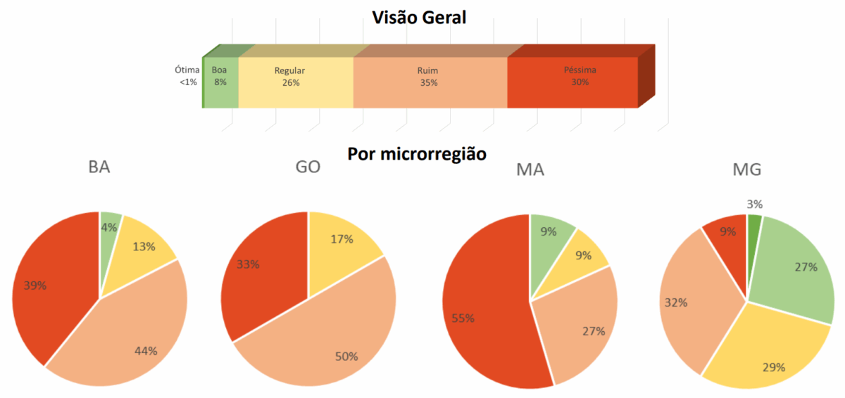 O panorama também traz uma avaliação das vias em oito regiões prioritárias – Imperatriz (MA), Uberlândia (MG), Paragominas (PA), Meia Ponte (GO), Porto Seguro (BA), Dourados (MS), Guarapuava (PR) e Sinop (MT). Nesses pontos, foram feitas entrevistas com diferentes agentes, como motoristas e produtores rurais, sobre a situação das estradas vicinais.