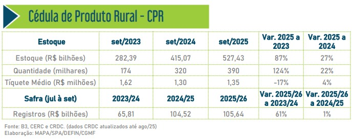 Na análise do recorte de julho a setembro deste ano, as CPRs tiveram uma variação positiva de 1% comparado ao mesmo período da safra passada. Ao todo, os registros de CPRs nesse período foi de R$ 105,64 bilhões frente aos R$ 104,52 bilhões do ano passado.