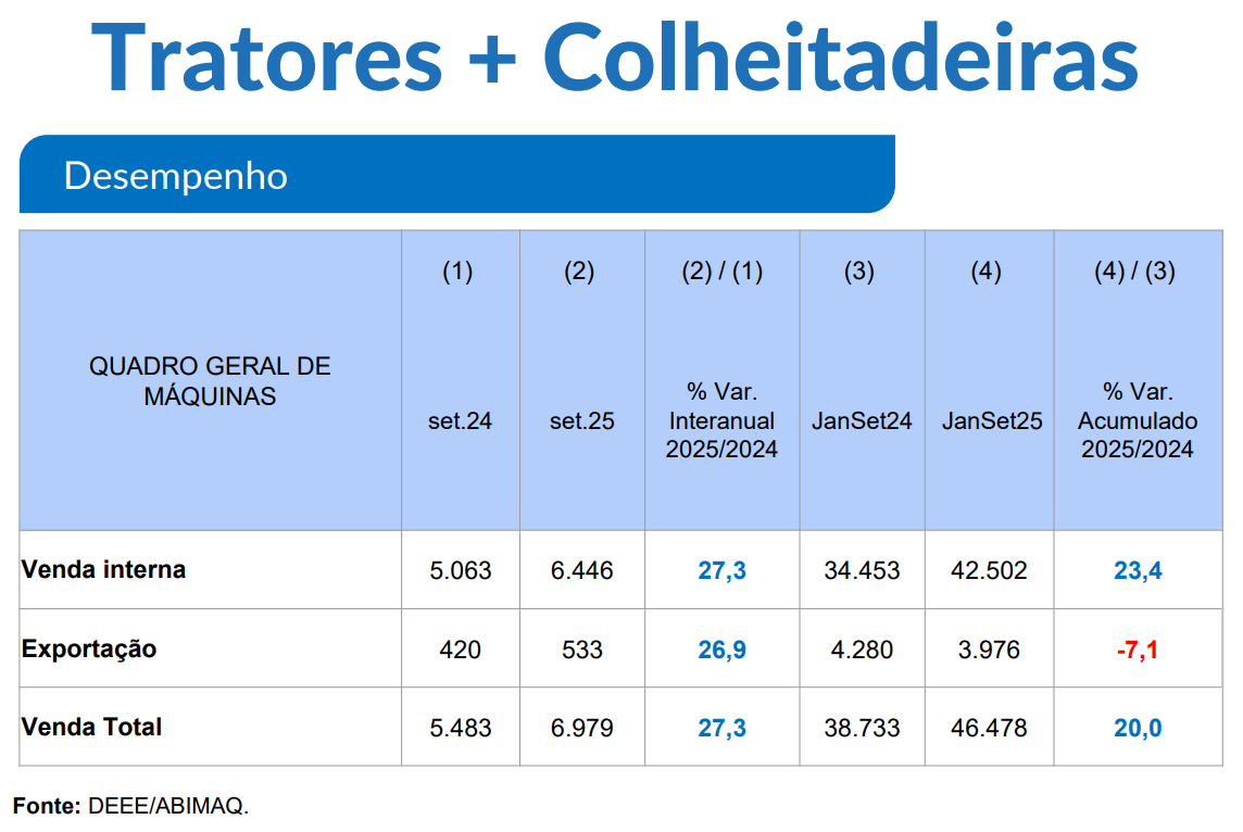 A indústria brasileira de máquinas agrícolas apresentou desempenho positivo em setembro de 2025, com crescimento nas vendas internas.