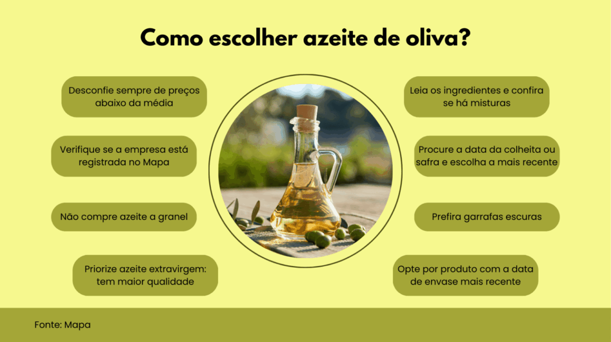 Segundo o Mapa, deve-se verificar a data de fabricação e de envase, preferindo azeites mais novos, pois quanto mais recente, melhor a qualidade tende a ser. É recomendado desconfiar de preços muito baixos e marcas com histórico problemático que podem ser verificadas nesta lista de produtos irregulares já apreendidos em ações do Mapa.
