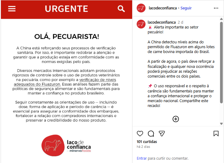 A Minerva Foods informou, nesta semana, por meio da rede social ‘Laço de Confiança’, dedicada ao programa de relacionamento com os pecuaristas, que a China detectou níveis acima do permitido do carrapaticida fluazuron em alguns lotes enviados pelo Brasil ao País.