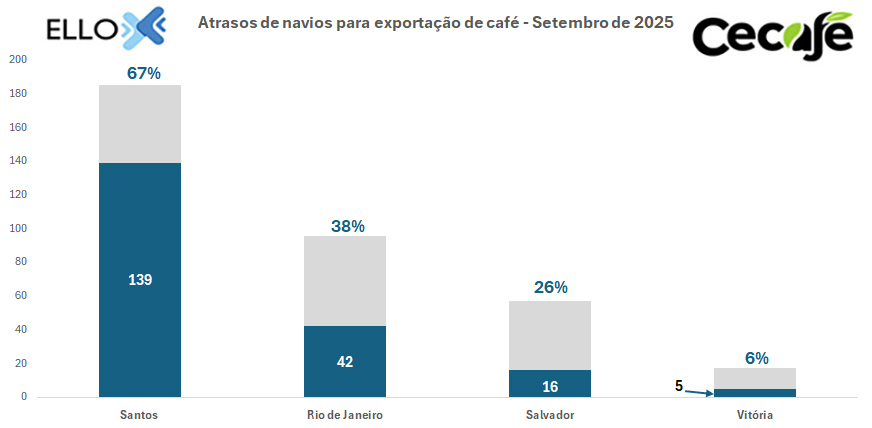 Em setembro de 2025, 57% dos navios, ou 202 de um total de 355 embarcações, enfrentaram atrasos ou alterações de escalas nos principais portos do Brasil, conforme aponta o Boletim Detention Zero (DTZ), elaborado pela startup ElloX Digital em parceria com o Cecafé.