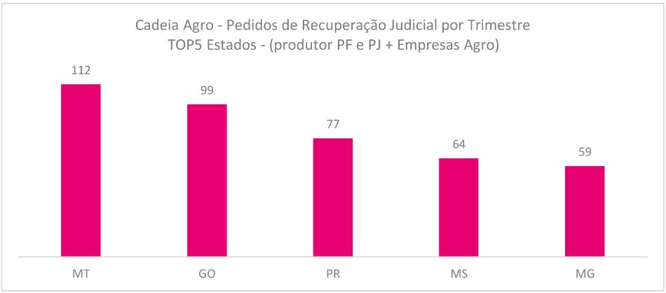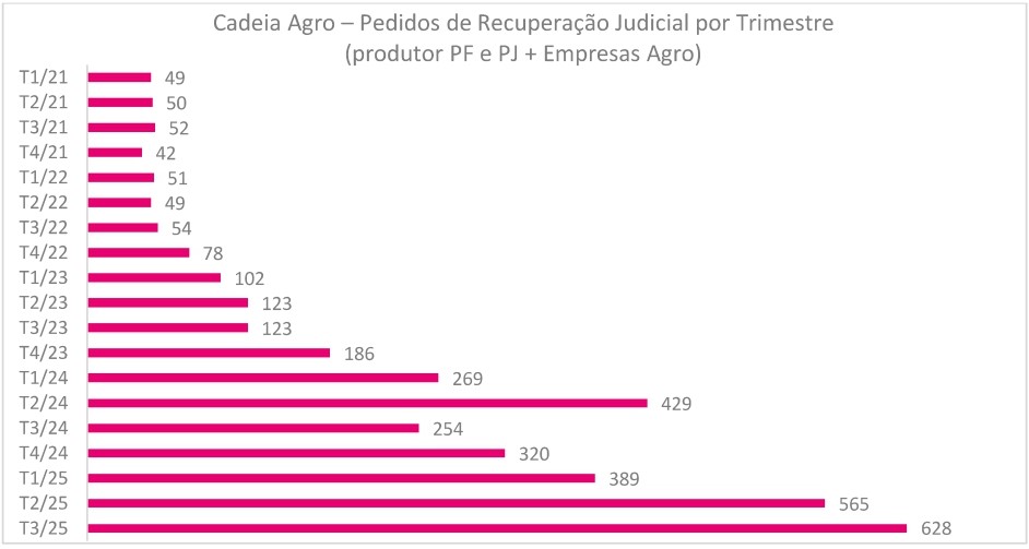 Mas não apenas os produtores foram impactados. Companhias que integram a cadeia agroindustrial — como indústrias de processamento, distribuidoras e empresas de insumos — registraram 131 pedidos de recuperação judicial. Esse número é mais que o dobro do observado no mesmo período de 2024, quando houve 56 solicitações, mostrando uma expansão de 134% no período de um ano. Já em relação ao segundo trimestre deste ano, que contabilizou 102 pedidos, nota-se um avanço de cerca de 28%.