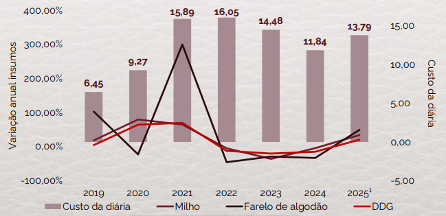 O aumento acompanha a alta no preço dos insumos utilizados na dieta bovina. O farelo de algodão, por exemplo, foi o que registrou a maior elevação, com avanço de 49,35%, seguido pelo milho, que subiu 33,98%. Já o DDG, que vem ganhando espaço pela boa relação custo-benefício na atividade, apresentou a menor alta entre os insumos analisados, de 20,33% no comparativo anual.