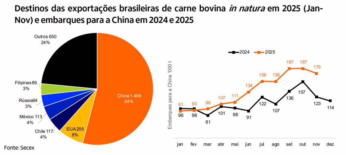 Para 2026, o Itaú BBA projeta uma queda de cerca de 2% na produção brasileira de carne bovina. Caso esse cenário se confirme, haverá uma redução aproximada de 200 mil toneladas na oferta total da proteína vermelha. Esse volume corresponde em torno de um terço do volume que precisaria ser realocado no cenário de maior potencial de compras chinesas. “Isto, caso as exportações brasileiras para a China em 2026 repetissem o recorde observado em 2025”, ponderam os especialistas.